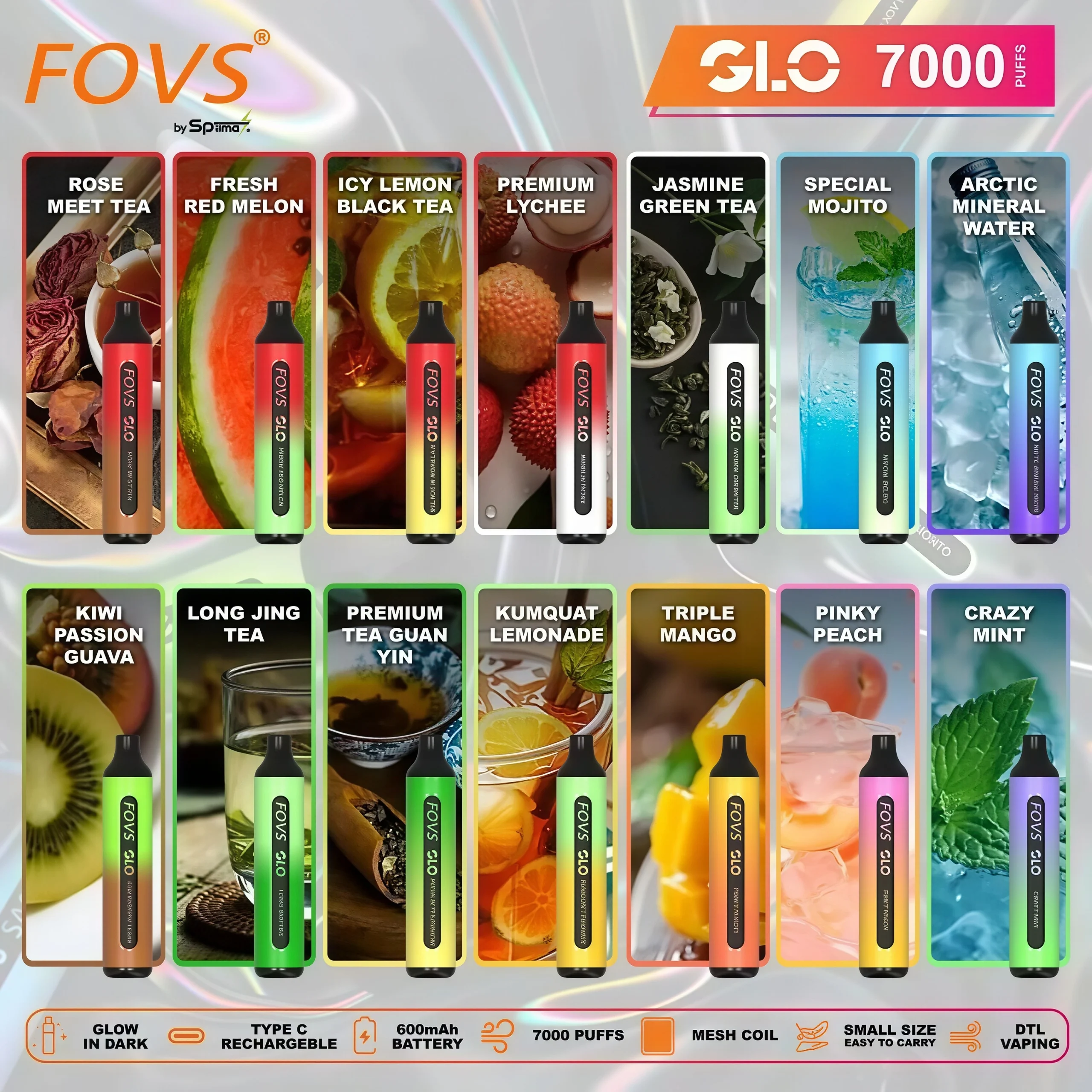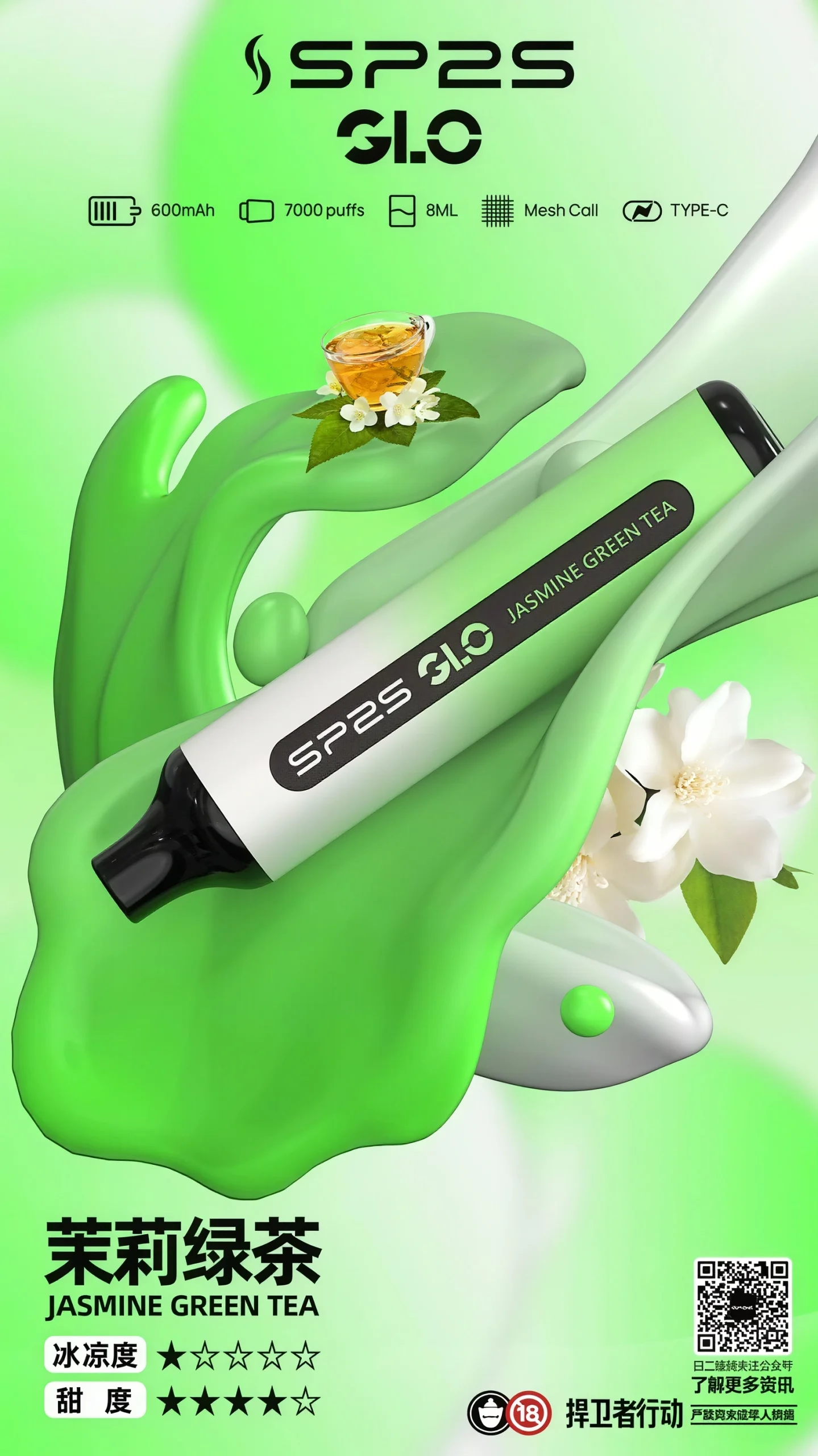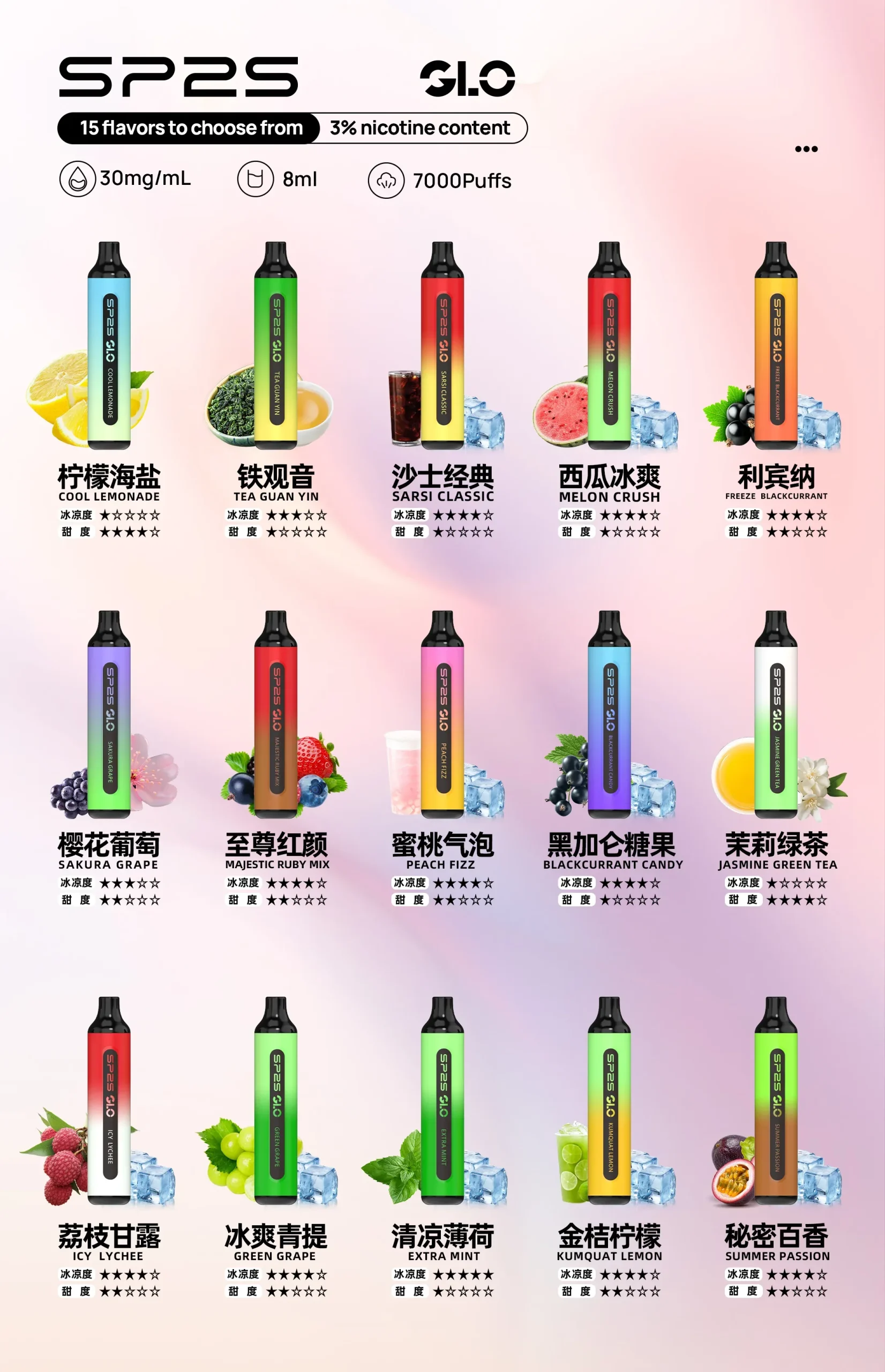 SP2 7000口拋棄式電子菸結合 8ml 大容量煙油、600mAh 可充電電池與雙網狀霧化芯。